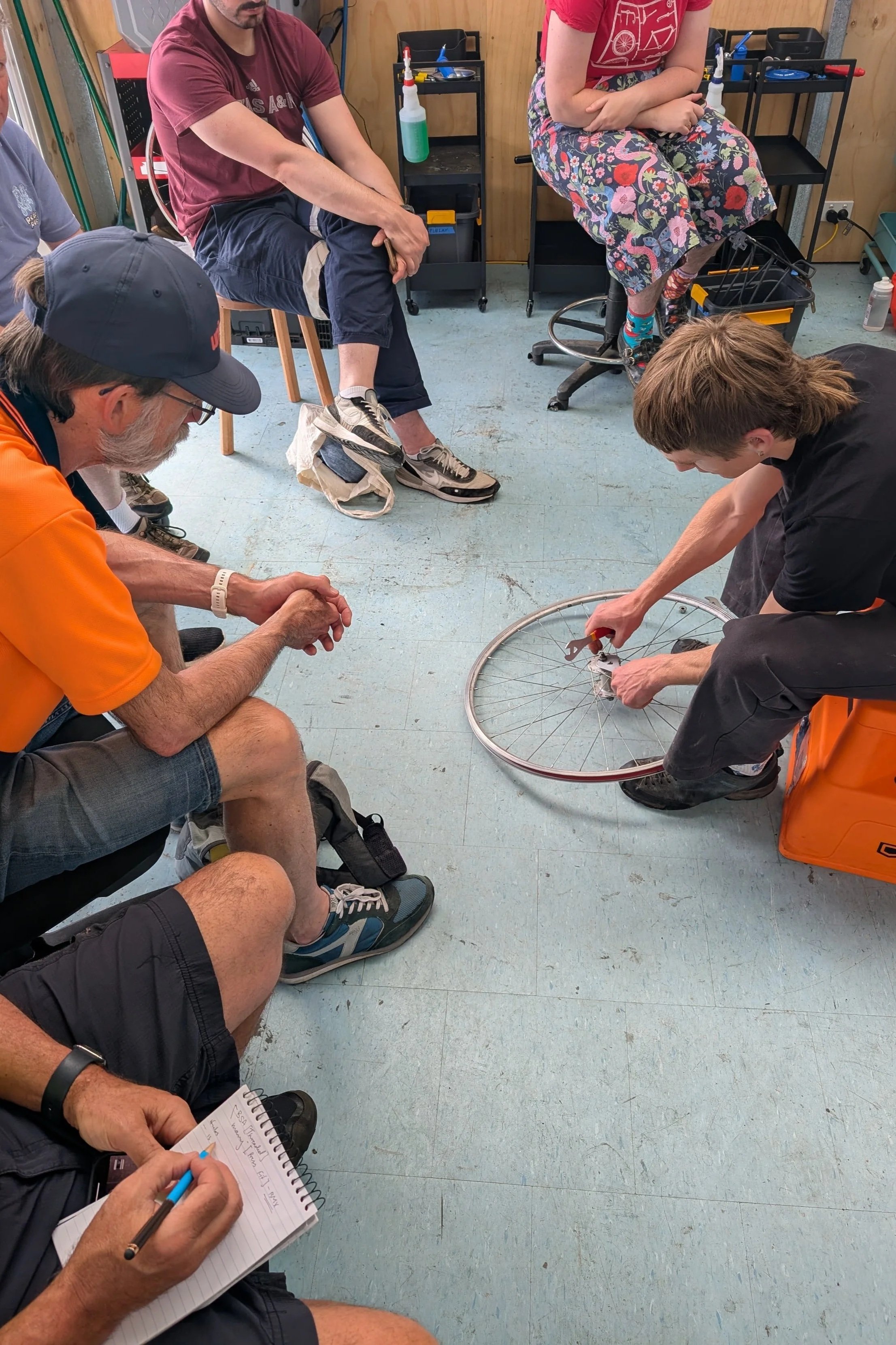Community bike mechanic, Cohen, right, sharing bike fixes with our bike kitchen attendees